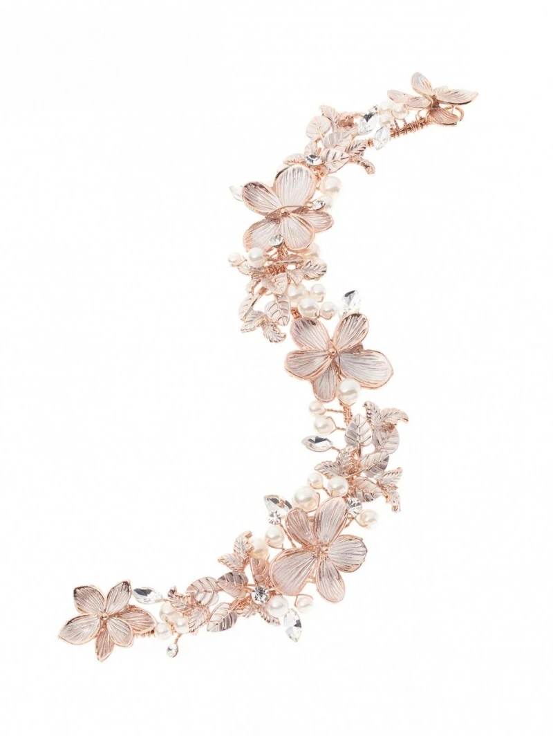 Details: roségoudkleurig flexibel haarornament; roségoudkleurige bloemen, parels, strass, kristallen