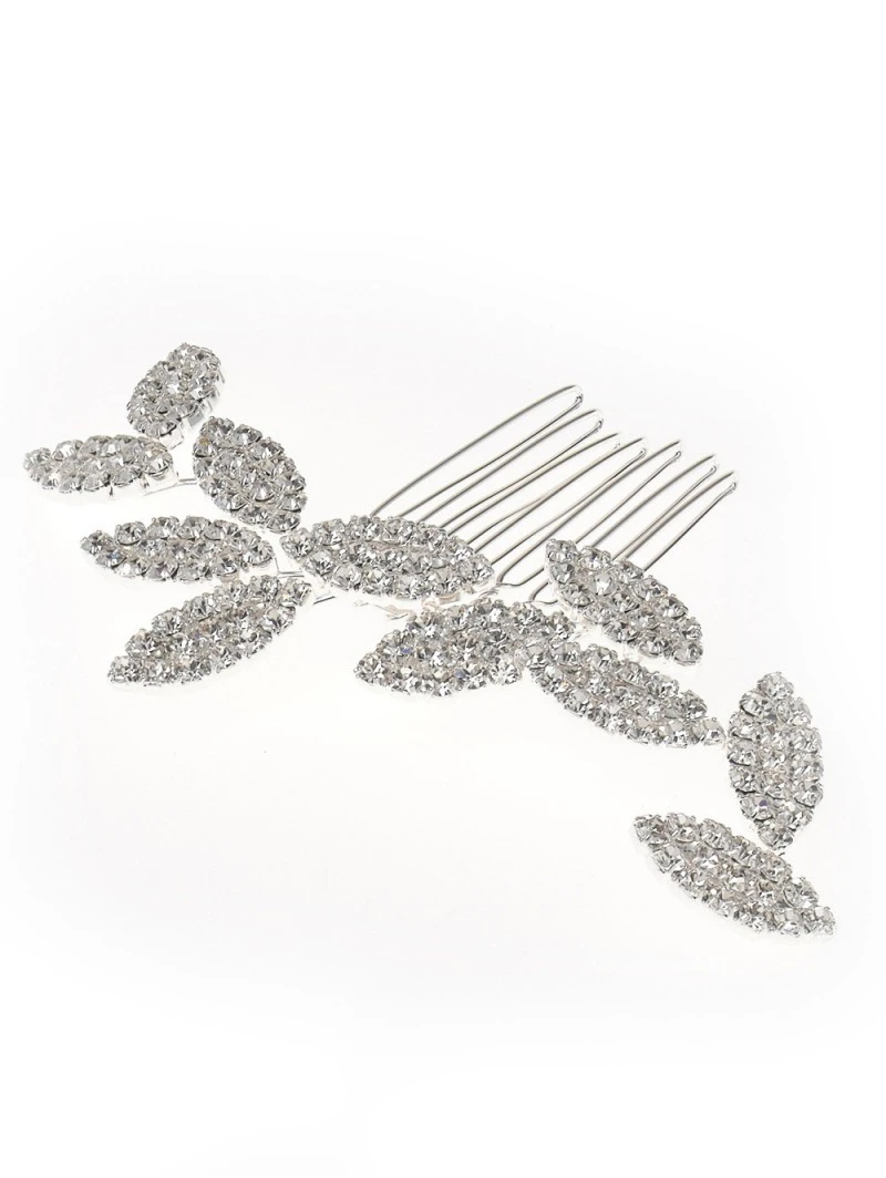 Details: zilverkleurige haarversiering in bladvorm met strass-steentjes op kam