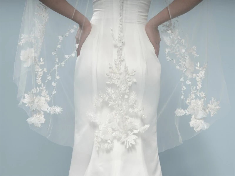 Sluierrand: deluxe 3D-bloemversiering, borduursel, bloemetjes versierd met pailletjes en kristalletjes, organza bloemetjes