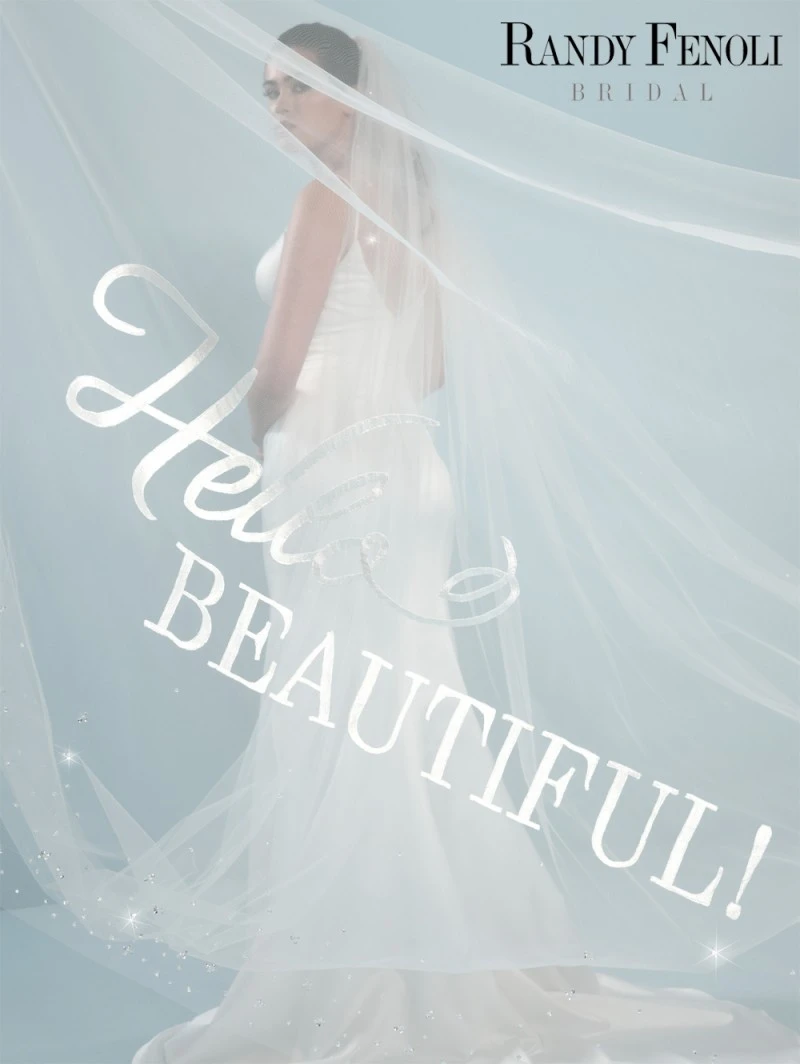 Details: sluier met kristallen, pailletten en geborduurde tekst “Hallo Beautiful”.